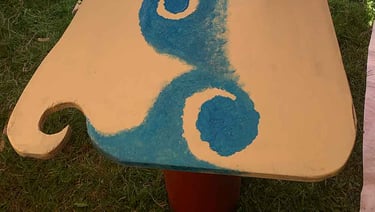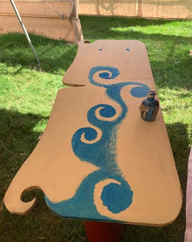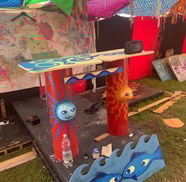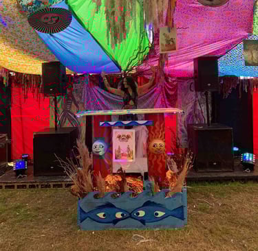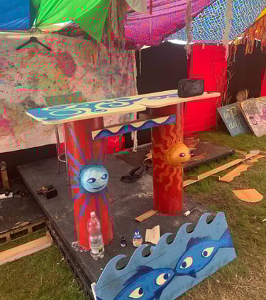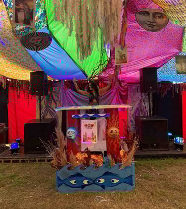 The DJ booth and stage design have an ethereal, almost mystical atmosphere. The booth itself is painted with swirling patterns of sun and waves, giving off a sense of cosmic rhythm that resonates with the festival’s energy. The blue and red pillars represent the forces of nature: one side radiates warmth and sunshine, while the other brings the calm, ying & yang, mysterious depths of the ocean. Two faces, each with eyes that seem to follow you, give life to the design, as if watching over the scene with a playful spirit.