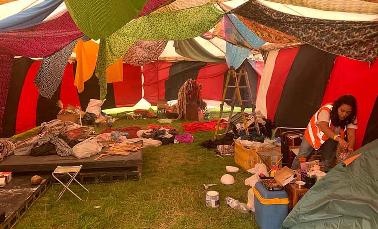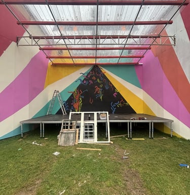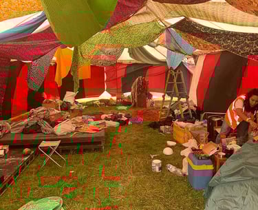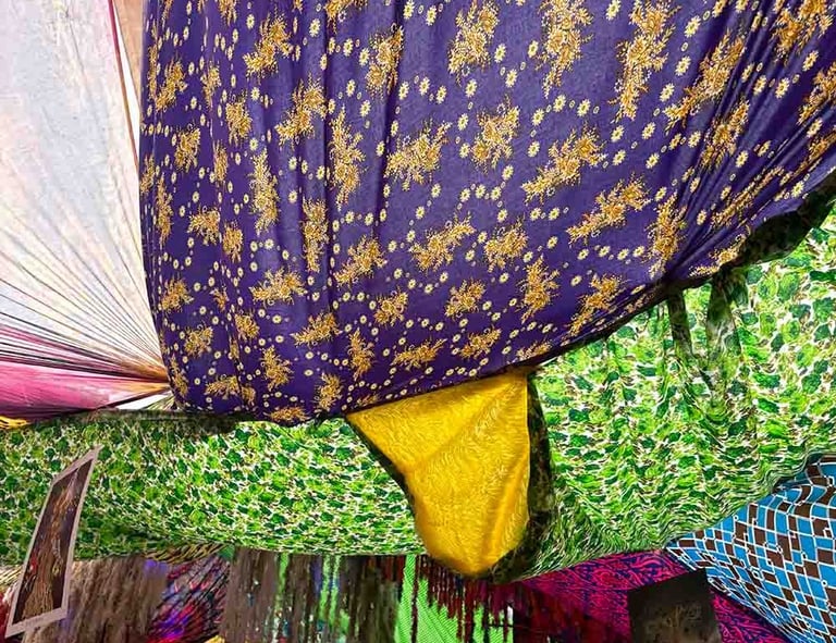 The immersive quality of the space is undeniable. The ceiling design pulls your gaze upward, as if reminding you to dream, to imagine, to reconnect with something greater. It’s a canopy of contrasts—playful yet profound, structured yet spontaneous—perfectly capturing the spirit of the festival. It’s more than a shelter from the elements; it’s a cocoon where strangers become friends, where art and humanity meet, and where every detail whispers;