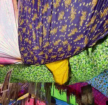 The ceiling above transforms into a kaleidoscope. Vibrant, textured fabrics that cascade down in flowing layers, each piece carefully chosen to add depth, warmth, and a sense of wonder. A cocoon of creativity, a space that feels alive and intimate. The mix of patterns tells a story, drawing inspiration from diverse cultures and artistic expressions, blending geometric prints, floral bursts, and ancient motifs into one harmonious vision field.